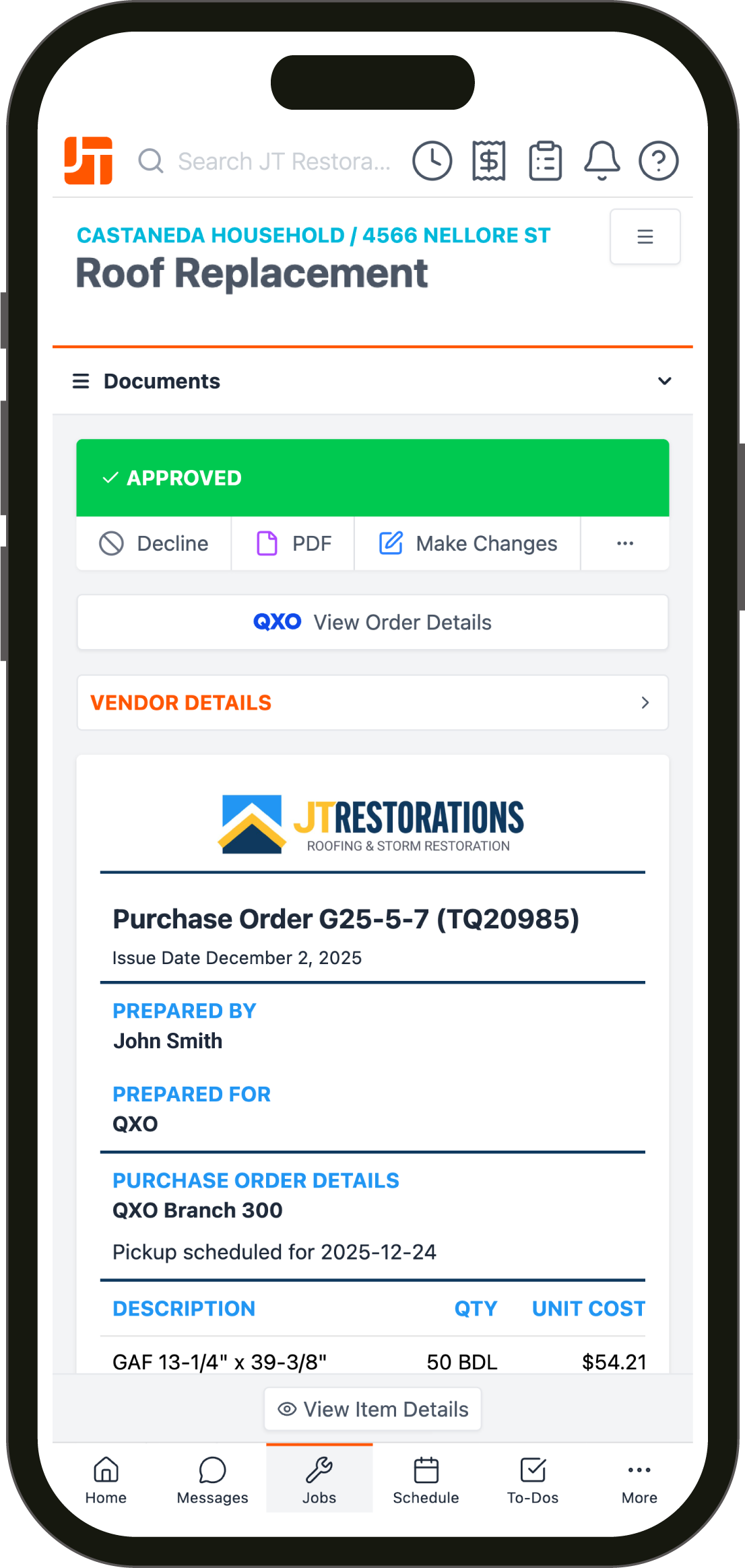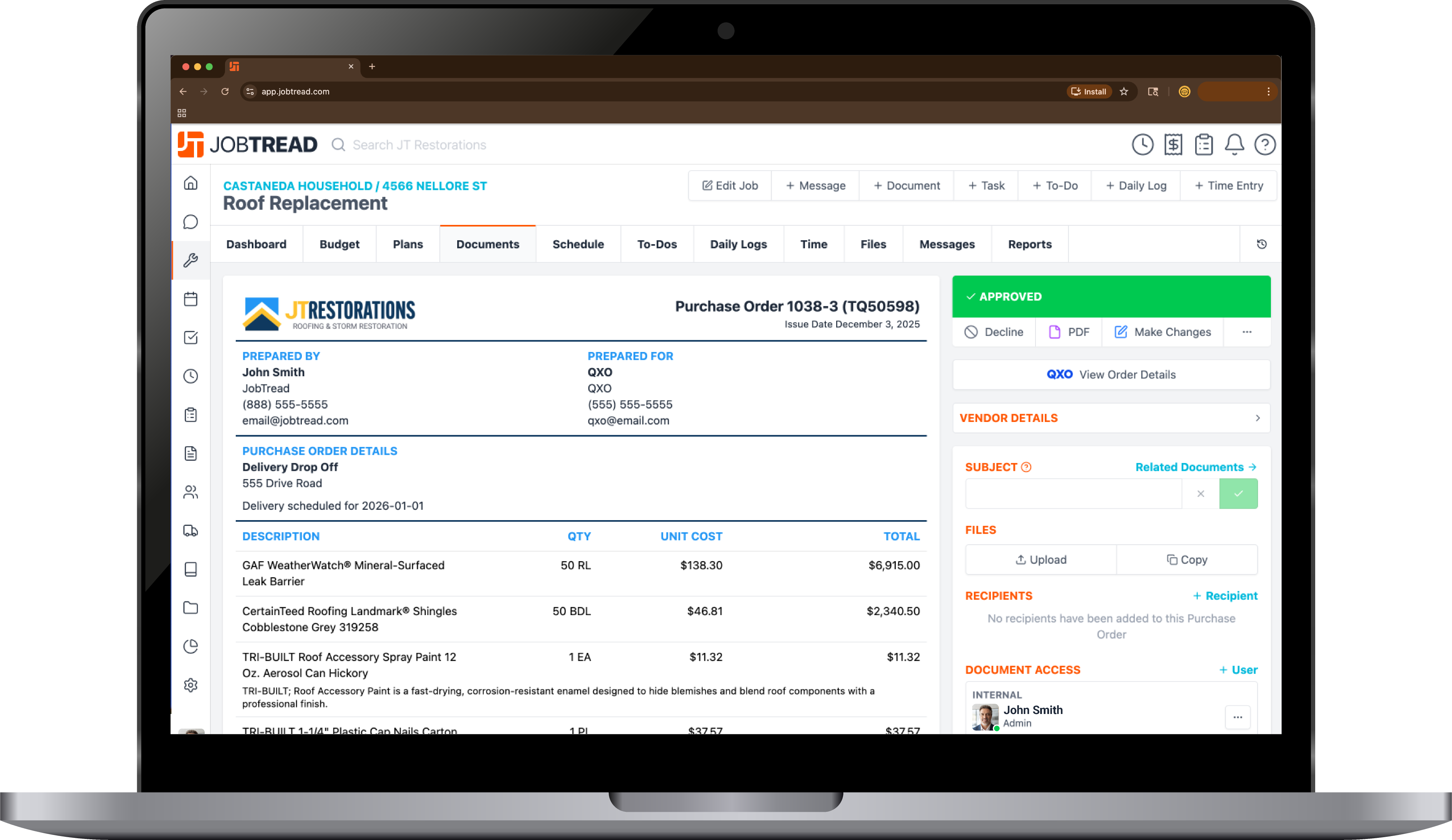 Place Orders Directly Through JobTread Send POs straight to QXO without calls or emails. Convert approved estimates into orders in seconds.